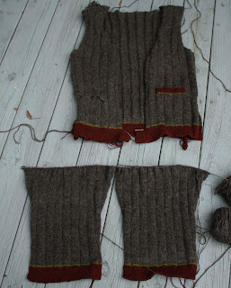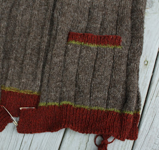 This shows that I've been able to finish the front and I have about 30 more rows on both sleeves before they're finished. I also did add the contrasting color to the pocket edging, which I think looks quite fine. I'm pretty certain I'll finish it before the new year.